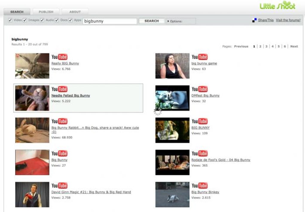 O visual do LittleShoot é limpo e o uso, bastante simples. Execute a busca, acompanhe os resultados e faça o download do mesmo modo que em qualquer outra página. Visualize vídeos do YouTube e fotos do Flickr na hora, com um simples clique.